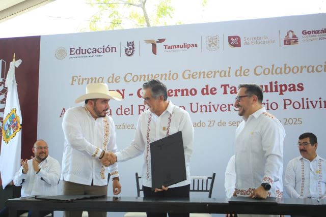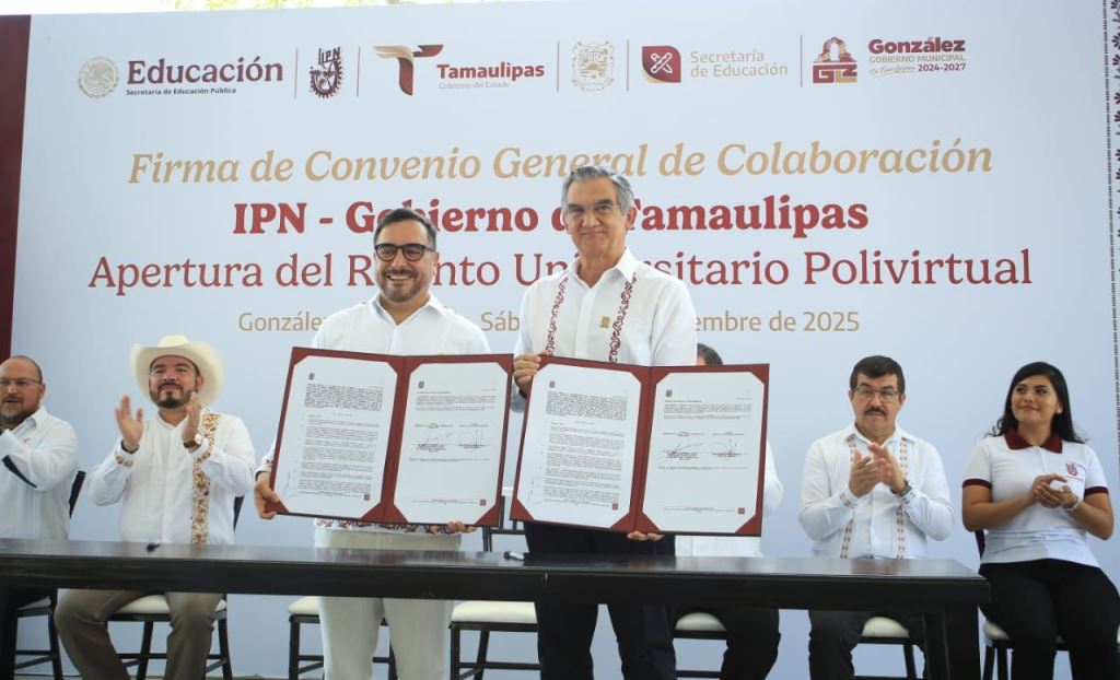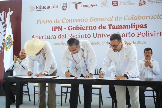 González, Tamaulipas.- El gobernador Américo Villarreal Anaya firmó el convenio de colaboración con el Instituto Politécnico Nacional e inauguró el Recinto Universitario Polivirtual, una nueva plataforma académica con la calidad y la excelencia educativa que distingue a esta prestigiada institución y que, por primera vez, se pone en marcha en todo el país.
