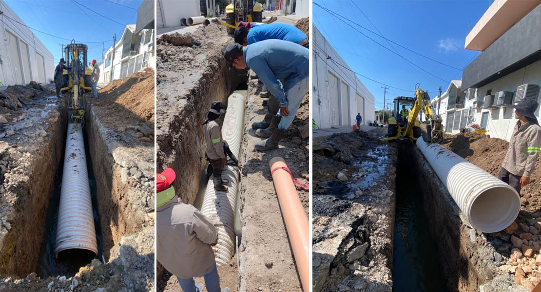 En estas acciones se lleva a cabo el reemplazo de 110 metros lineales de tubería obsoleta por ductos de PVC de 24 pulgadas de diámetro, con la finalidad de garantizar el óptimo funcionamiento del sistema de drenaje en este sector, brindando un servicio más eficiente a los usuarios.