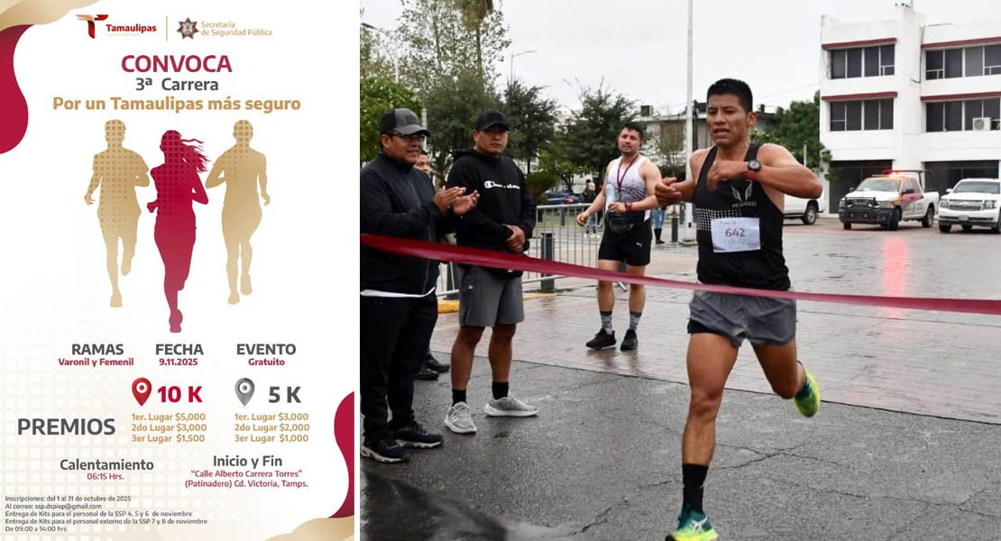 Bajo el lema “Por un Tamaulipas más seguro”, atletas compartirán su pasión por el deporte junto al personal operativo y administrativo de la SSPT en las distancias de 05 y 10 kilómetros, rutas que inician y culminan en el Patinadero de la calle Alberto Carrera Torres, en Ciudad Victoria.