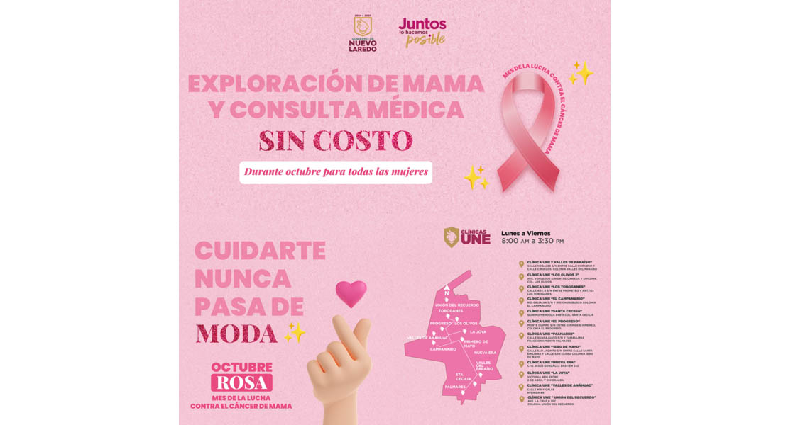 Nuevo Laredo, Tam.- En el marco de Octubre Rosa, el Gobierno Municipal de Nuevo Laredo invita a todas las mujeres a aprovechar la campaña gratuita de exploración de mama y consulta médica que se realiza en las Clínicas UNE.