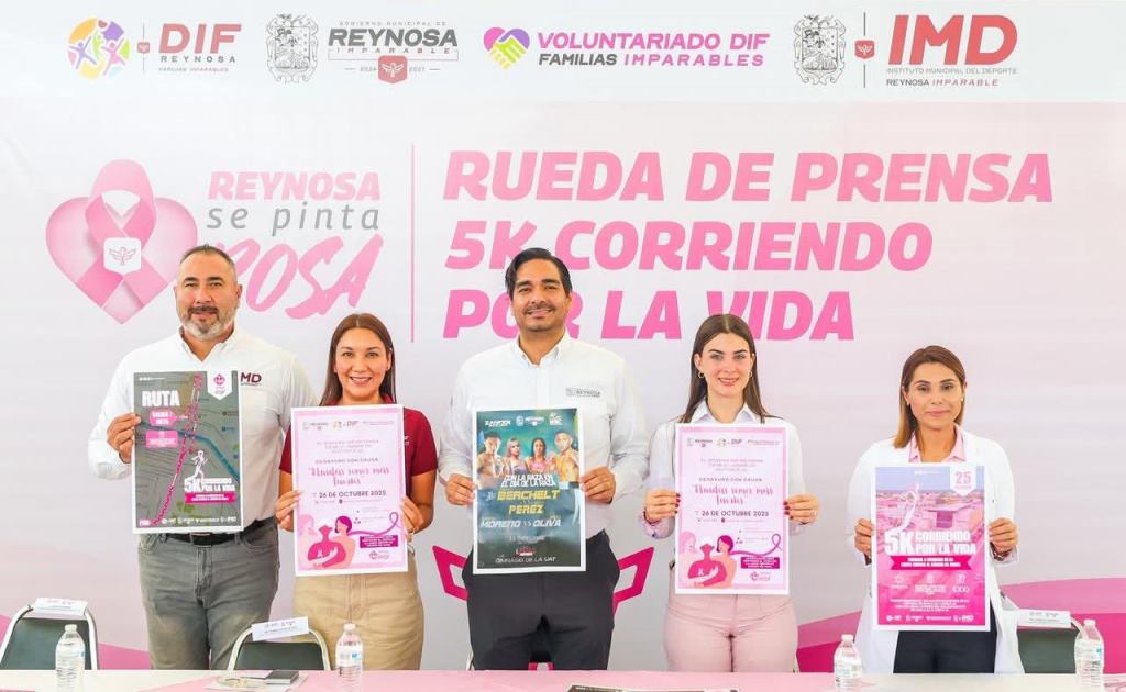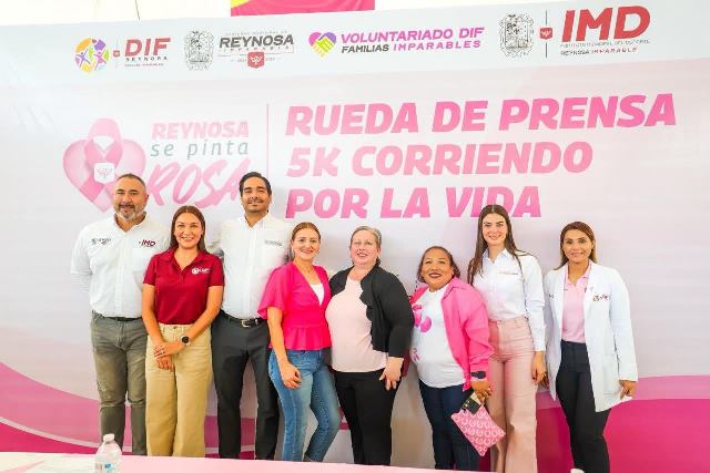 El Presidente Municipal Carlos Peña Ortiz y la Presidenta de Damas Voluntarias del DIF-Reynosa, dieron a conocer detalles de la Carrera 5K como parte de la Campaña de Prevención del Cáncer de Mama 2025, además del “Desayuno con Causa”.