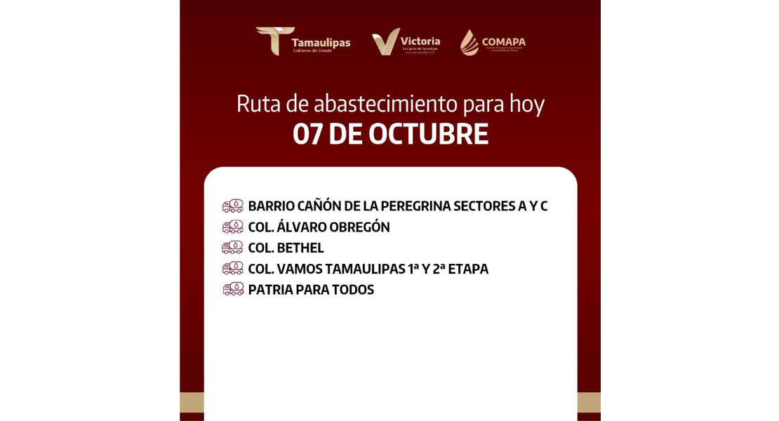 En COMAPA Victoria trabajamos para que el agua llegue a cada rincón de la ciudad. Este día, el servicio de abastecimiento se realiza en: