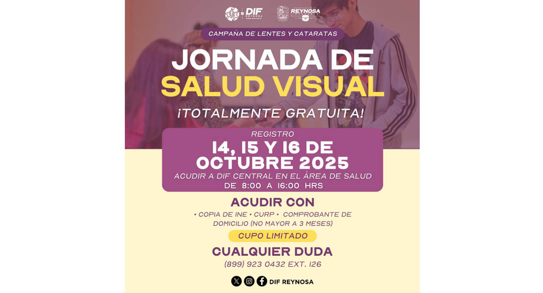 Reynosa, Tam.- Con el objetivo de seguir mejorando la salud visual de la población más vulnerable, el Sistema DIF-Reynosa que preside Carlos Luis Peña Garza, convoca a la ciudadanía a participar en la Jornada de Salud Visual, para beneficiar a las familias con revisión de la vista, lentes y operaciones de Cataratas, donde médicos especialistas del Hospital La Carlota de Montemorelos, Nuevo León ofrecerán valoraciones oftalmológicas totalmente gratuitas.