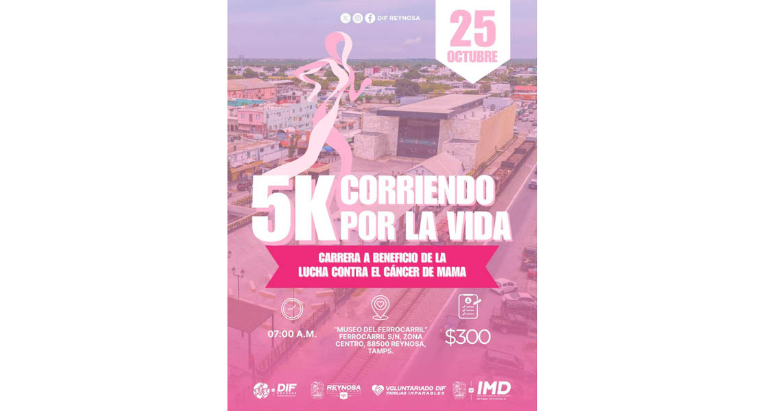 Reynosa, Tam.- El Sistema DIF-Reynosa que encabeza Carlos Luis Peña Garza, invita a agrupaciones, corredores y a toda la ciudadanía a participar en la Carrera 5K “Corriendo por la Vida”, una actividad que combina deporte, solidaridad y conciencia social, en el marco de la lucha contra el cáncer de mama.