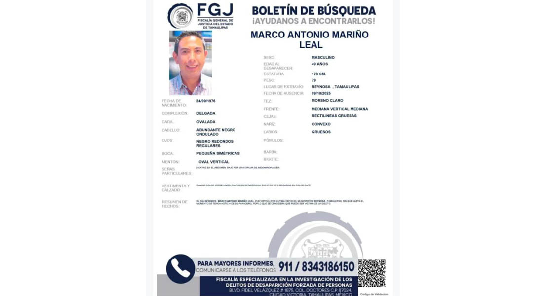Cd. Victoria, Tamaulipas.- La Federación de Cámaras Nacionales de Comercio (FECANACO) Tamaulipas expresó su profunda preocupación y solidaridad por la desaparición del empresario Marco Antonio Mariño Leal, integrante activo de la organización, cuyo paradero se desconoce desde la tarde del pasado jueves 9 de octubre tras su visita a Reynosa.