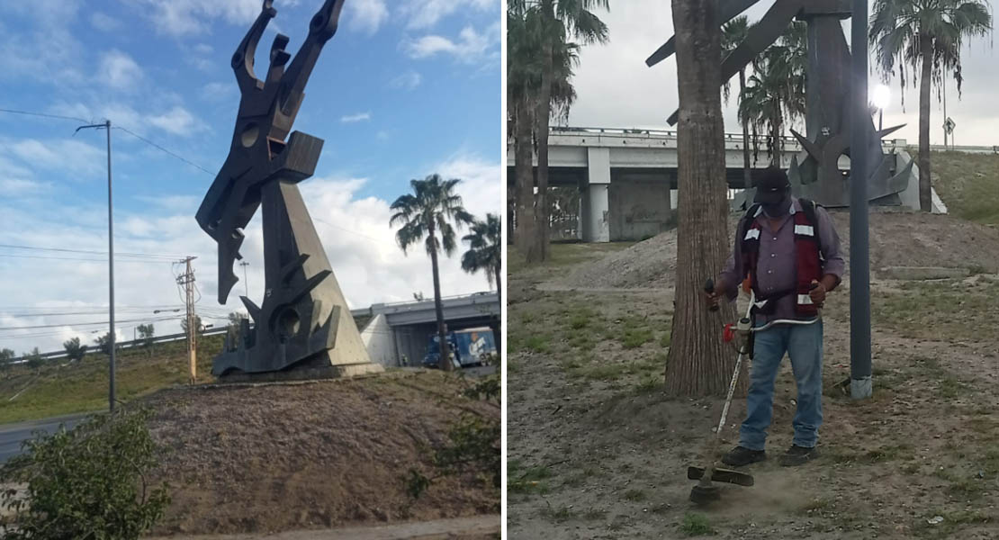 Mantenimiento en Monumento Reynosa con realizaron trabajo de corte de maleza, limpieza general, barrido y raspado de banquetas y cordones en el monumento de la carretera Monterrey-Reynosa.
