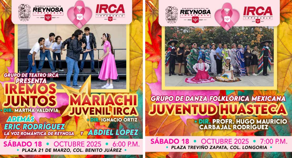 Reynosa, Tam.- El Gobierno de Reynosa, que preside el Alcalde Carlos Peña Ortiz, invita al público a disfrutar del programa artístico del Instituto Reynosense para la Cultura y las Artes este sábado 18 de octubre.