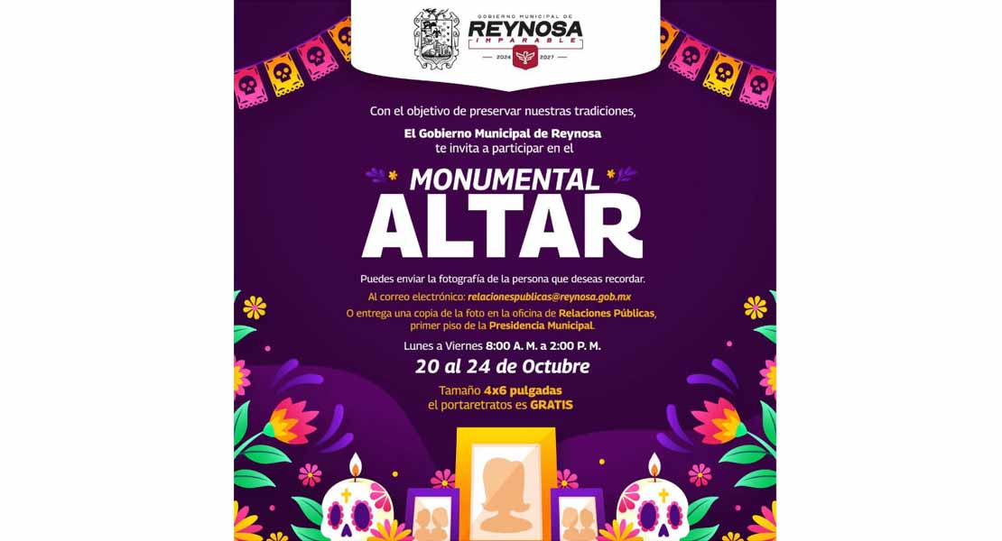 Reynosa, Tam.- El Presidente Municipal Carlos Peña Ortiz invita a la comunidad a ser parte de la preservación de las tradiciones nacionales, en el Monumental Altar, de la plaza principal Miguel Hidalgo de Reynosa, con el que se celebra a quienes ya no están físicamente con nosotros.