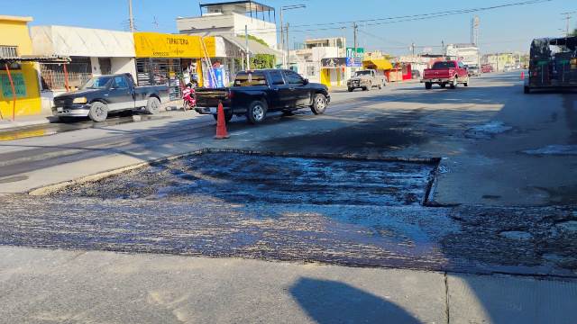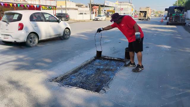 En la Avenida Central, de la colonia Las Cumbres se realizó la reparación de baches con carpeta caliente para brindar una superficie de rodamiento suave y segura, así como en la Calle 14, de la colonia Aztlán.