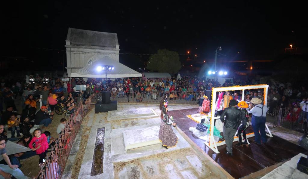 Más tarde, a partir de las 7:00 de la tarde, el Panteón Municipal Antiguo se convertirá en escenario para una puesta en escena de la Compañía de Teatro Adolfo López Mateos y un espectáculo folclórico del ballet Macehuani del CBTIS 137, que llenarán de vida y color este emblemático espacio.