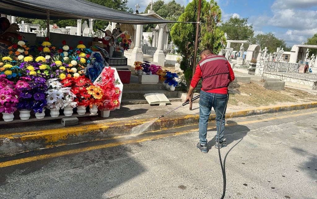 Reynosa, Tam.- Con el objetivo de ofrecer espacios seguros y limpios para los visitantes, el Gobierno Municipal de Reynosa, encabezado por el Presidente Carlos Peña Ortiz, ha puesto en marcha un operativo de limpieza y fumigación en los panteones municipales, incluyendo el Sagrado Corazón.