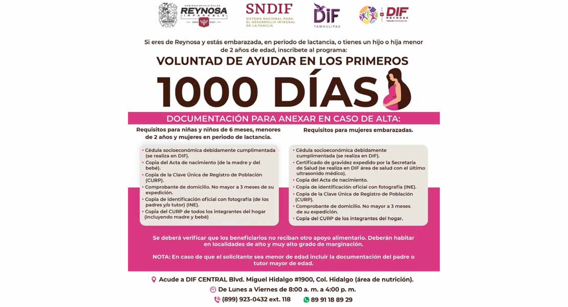 Reynosa, Tam.- Con el propósito de continuar impulsando el bienestar de las familias y apoyar a mujeres embarazadas, así como a niñas y niños en sus primeros años de vida, el Sistema DIF-Reynosa invita a inscribirse al programa “Voluntad de Ayudar en los Primeros 1000 Días”, una iniciativa que promueve la buena nutrición y el desarrollo saludable durante las etapas más importantes de crecimiento.