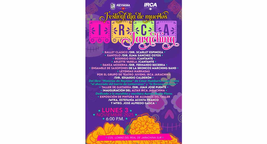 Reynosa, Tam.- El Gobierno de Reynosa, que preside el Alcalde Carlos Peña Ortiz, invita al público a disfrutar el tradicional Festival del Día de Muertos este lunes 3 de noviembre a las 6:00 P. M. en la sede Jarachina del Instituto Reynosense para la Cultura y las Artes.