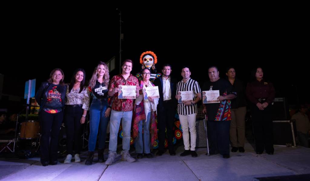 H. Matamoros, Tamaulipas.- El alcalde Beto Granados encabezó la premiación del Concurso de Catrinas Monumentales, realizado en el marco de la tradicional Callejoneada de la calle 9, una de las actividades más esperadas del Festival de la Huesuda 2025.