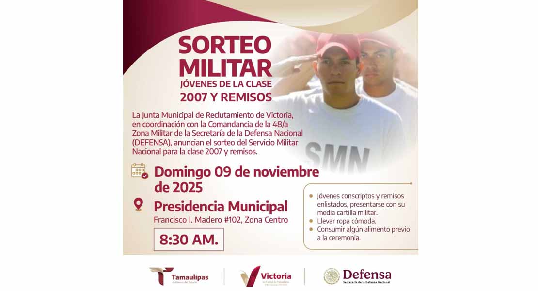 Cd. Victoria, Tam.- En la coordinación y apoyo entre el Gobierno de Victoria que preside Eduardo Gattás Báez y la Secretaría de la Defensa Nacional, este domingo 9 de noviembre se estará realizando en esta capital el sorteo del Servicio Militar Nacional para la clase 2007 y remisos.