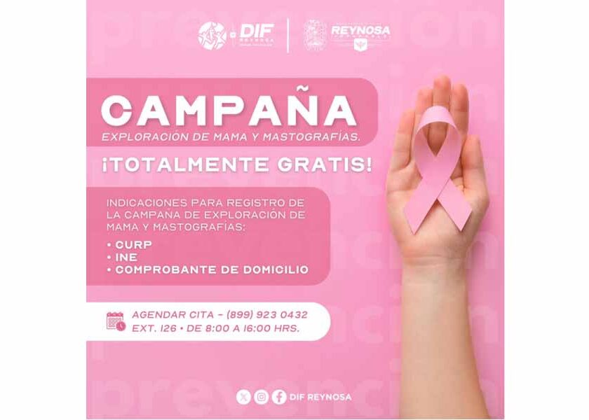 Reynosa, Tam.- Por instrucciones del Presidente Municipal, Carlos Peña Ortiz, el Sistema DIF-Reynosa que preside Carlos Luis Peña Garza, la campaña gratuita de Exploración de Mama y Mastografías, permanecerá vigente durante lo que resta del año, con el objetivo de seguir promoviendo la detección oportuna del cáncer de mama y fortalecer la salud de las mujeres reynosenses. Gracias al compromiso…