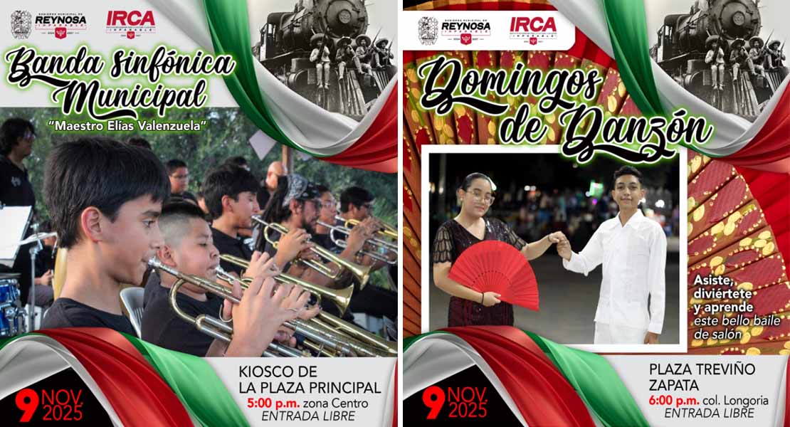 Reynosa, Tam.- Atendiendo las indicaciones del Presidente Municipal Carlos Peña Ortiz, el Instituto Reynosense para la Cultura y las Artes extiende una invitación a la ciudadanía para asistir a las actividades artísticas gratuitas programadas para este domingo 9 de noviembre.