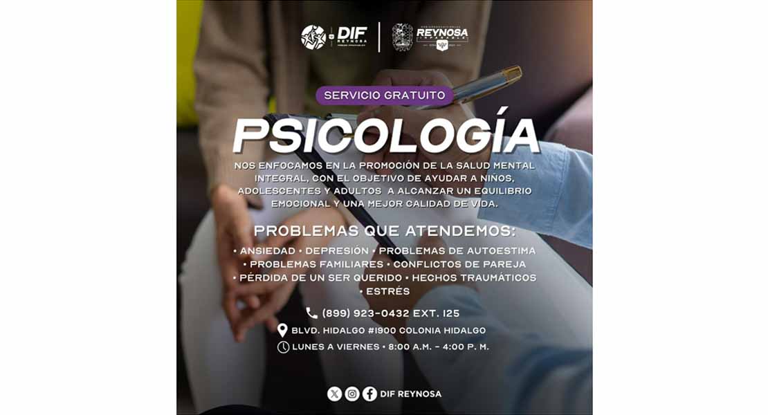 Reynosa, Tam.- Con el compromiso de promover el bienestar integral de la población, el Sistema DIF-Reynosa, que preside Carlos Luis Peña Garza, invita a la ciudadanía a aprovechar el servicio gratuito de psicología, disponible en las instalaciones del DIF Central, ubicado en bulevar Hidalgo 1900, en la colonia Hidalgo.