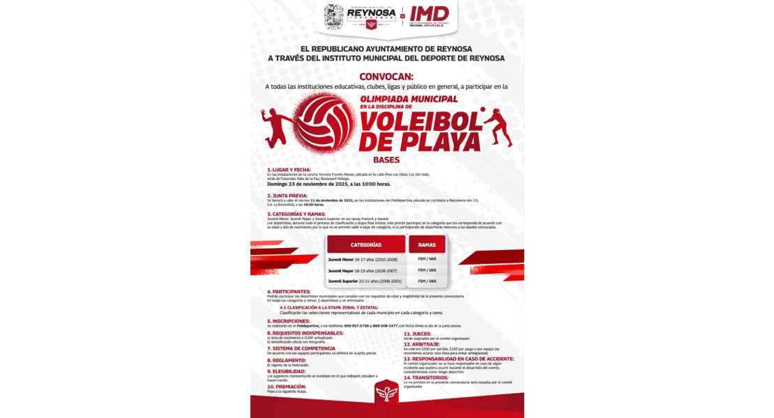 Reynosa, Tam.- El Alcalde Carlos Peña Ortiz invita a todas las instituciones educativas, clubes, ligas y público en general a participar en la Olimpiada Municipal en la disciplina de Voleibol de Playa, rumbo a la Olimpiada Nacional CONADE 2026, organizada a través del Instituto Municipal del Deporte.
