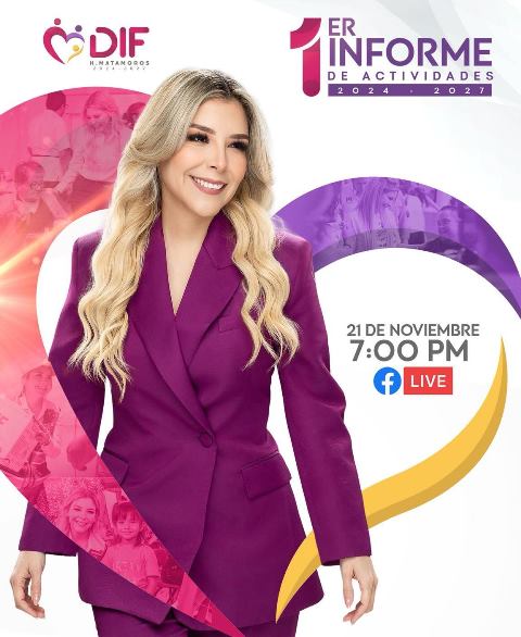 Matamoros, Tam.- La presidenta del Sistema DIF Matamoros, Ana Ariceaga de Granados, anunció que este viernes 21 de noviembre, a las 7:00 p.m., llevará a cabo la presentación de su Informe de Actividades correspondiente a su primer período al frente del organismo. La ceremonia será transmitida en vivo a través de la página de Facebook de la institución, invitando a la comunidad a acompañar y conocer de cerca los avances y logros alcanzados en beneficio de las familias matamorenses.