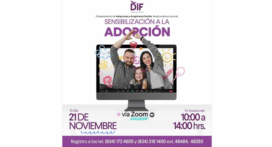 Nuevo Laredo, Tam.- El Sistema DIF Nuevo Laredo invita a las y los ciudadanos interesados en participar en el Curso de Sensibilización a la Adopción, que será impartido por el DIF Tamaulipas el próximo 21 de noviembre, en un horario de 10:00 a 14:00 horas, a través de la plataforma Zoom.