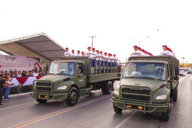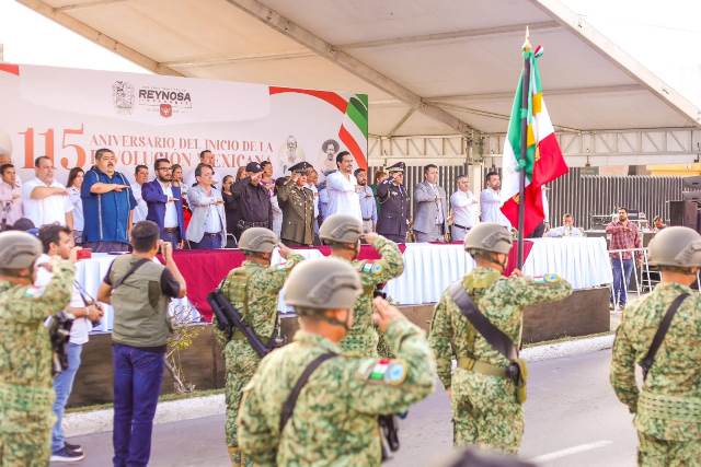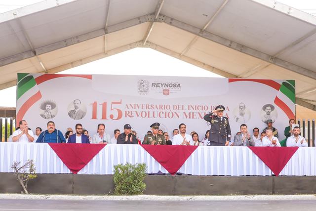 Reynosa, Tam.- Los reynosenses disfrutaron este jueves 20 de noviembre el Desfile Conmemorativo del 115 Aniversario del Inicio de la Revolución Mexicana, con el Alcalde Carlos Peña Ortiz, su esposa Alejandra Yelitza Garza, y el Coronel de Caballería Marco Antonio de la Fuente Barragán, Comandante del Décimo Noveno Regimiento de Caballería Motorizado de la Octava Zona Militar.
