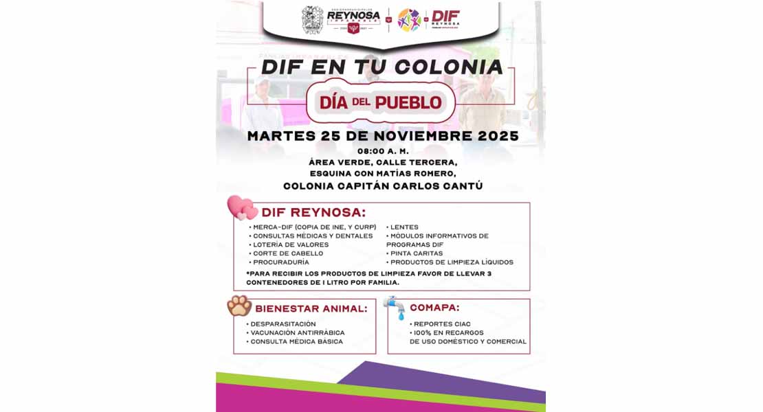 Reynosa, Tam.- Por instrucciones del Alcalde, Carlos Peña Ortiz, el Sistema DIF-Reynosa, llevará este martes 25 de noviembre una brigada a la colonia Capitán Carlos Cantú, con el propósito de acercar servicios y ofrecer atención directa a las familias.