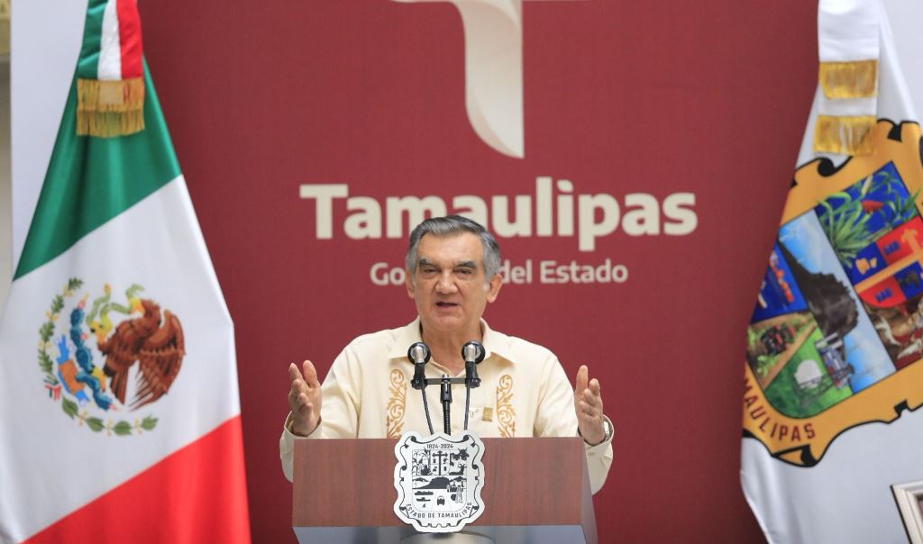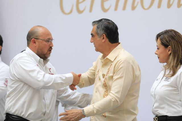 Tras la proyección de un video donde la directora de Protección Civil de Veracruz, Guadalupe Osorno, a nombre de la gobernadora Rocío Nahle da un reconocimiento al pueblo de Tamaulipas, por las labores de auxilio prestadas, el mandatario entregó litografías enviadas por la gobernadora al capitán Marcelo Israel Peña y al técnico auxiliar Fidel Eduardo Castro.