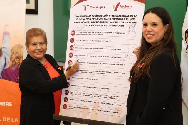 Cd. Victoria, Tam.- Con la presencia de la presidenta del Sistema DIF, Lucy de Gattás, el alcalde de Victoria Eduardo Gattás Báez firmó, junto a integrantes del Gabinete Municipal, el decálogo contra la violencia hacia la mujer para dar paso firme hacia un futuro libre de violencia de género.