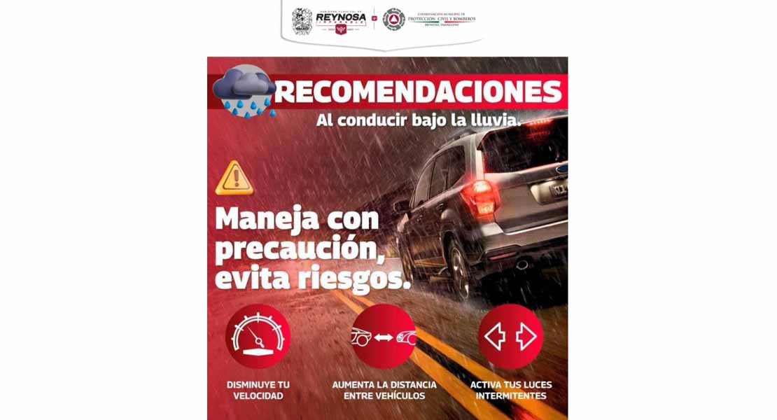 Reynosa, Tam.- La Coordinación de Protección Civil y Bomberos de Reynosa recomienda a los conductores manejar con extrema precaución debido a las condiciones climáticas actuales.