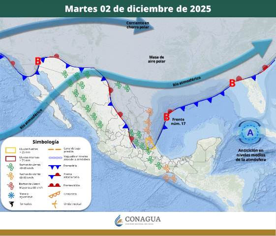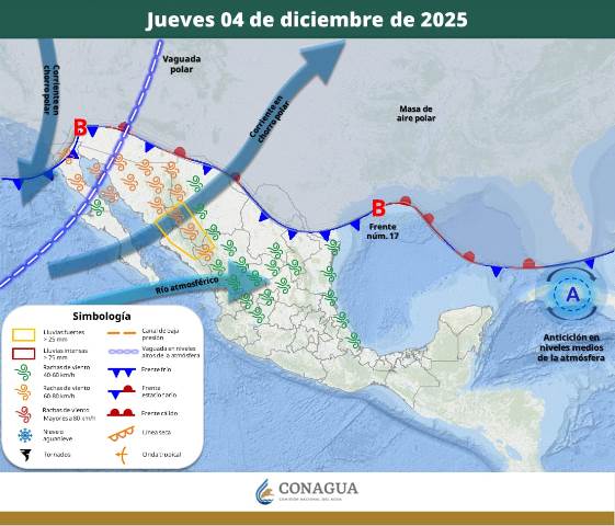 En el noroeste del país, una vaguada en niveles medios y altos, en interacción con las corrientes en chorro polar y subtropical, generará un ambiente más frío, lluvias aisladas y rachas de viento que podrían alcanzar los 60 km/h en Baja California Sur, Sonora, Chihuahua, Durango y Sinaloa.