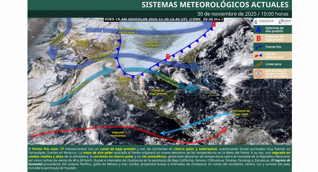 El frente frío número 17 avanza este domingo sobre el norte y noreste del país, generando condiciones de inestabilidad atmosférica que dejarán lluvias puntuales muy fuertes en Tamaulipas y un marcado descenso de temperatura en gran parte del norte del territorio nacional.