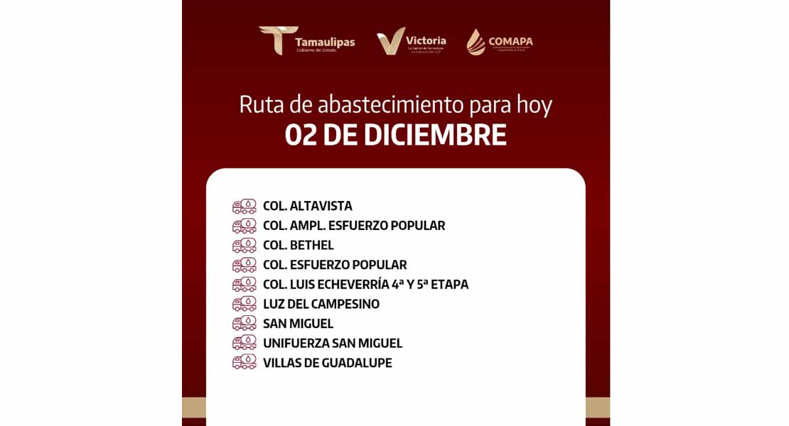 En COMAPA Victoria trabajamos para que el agua llegue a cada rincón de la ciudad. Este día, el servicio de abastecimiento se realiza en: