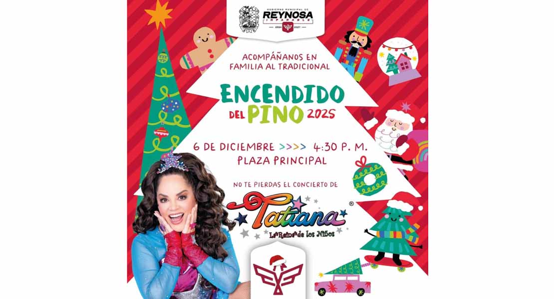 Reynosa, Tam.- Únete al Presidente Municipal Carlos Peña Ortiz en el tradicional Encendido del Pino este sábado 6 de diciembre en la plaza principal Miguel Hidalgo a partir de las 4:30 P. M. y déjate llevar por la magia de la temporada más esperada del año con el Concierto de Tatiana.