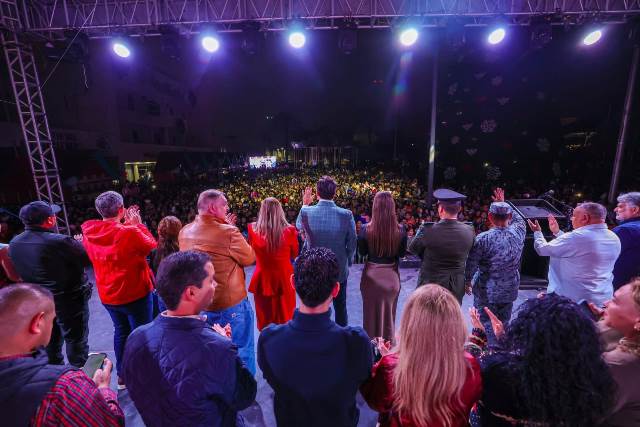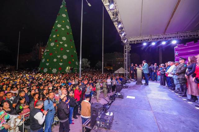 Reynosa, Tam.- En un cálido ambiente con más de 10 Mil reynosenses, el Alcalde Carlos Peña Ortiz, acompañado por su esposa Alejandra Yelitza Garza, encabezó el tradicional Encendido del Pino 2025 de 27 metros de altura y 5,950 metros de luces, en la plaza Miguel Hidalgo, marcando el inicio de la temporada navideña en la ciudad, también con el Concierto de Tatiana, La Reina de los Niños y la puesta en marcha del Carrusel Infantil.