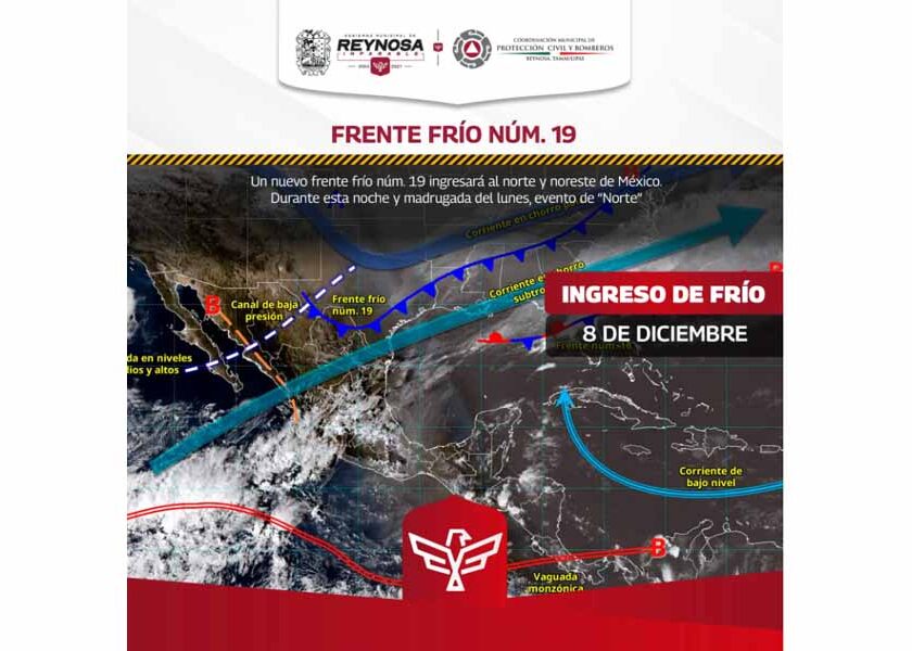 Reynosa, Tam.- La Coordinación de Protección Civil y Bomberos del Gobierno Municipal de Reynosa comparte información meteorológica para etapa región, que indica la llegada del Frente Frío Número 19, el cual traerá un notable descenso en la temperatura ambiente para Reynosa con mínima probable de 8° Centígrados para esta noche de domingo 7 y primeras horas de lunes 8 de…