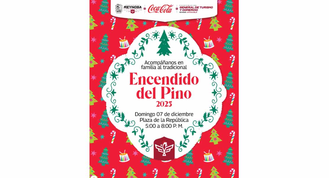 Reynosa, Tam.- El Presidente Carlos Peña Ortiz invita a la familias de Reynosa al tradicional Encendido del Pino 2025, de la Plaza de la República, asiste hoy domingo 7 de diciembre a partir de las 5:00 de la tarde y disfruta de grandes sorpresas para chicos y grandes; el Pino de Arca Continental se ubica ahí, donde comienza la Patria, para recibir con espíritu navideño a los visitantes de nuestro país, vive hoy el colorido de la época con el Alcalde y las familias asistentes.
