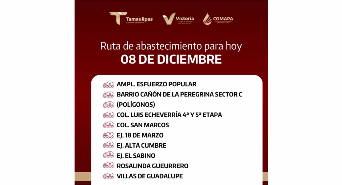 En COMAPA Victoria trabajamos para que el agua llegue a cada rincón de la ciudad. Este día, el servicio de abastecimiento se realiza en: