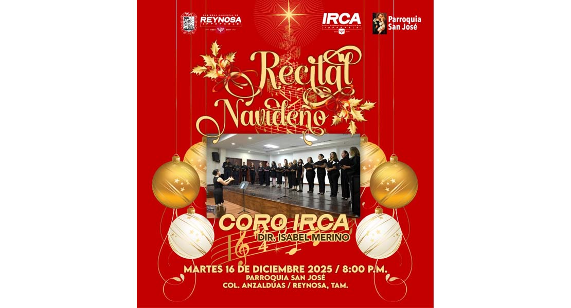 Reynosa, Tam.- El Gobierno de Reynosa, que preside el Alcalde Carlos Peña Ortiz, invita al público a disfrutar del Recital Navideño que se llevará a cabo el martes 16 de diciembre a las 8:00 P. M. en la Parroquia San José, en la colonia Anzaldúas.