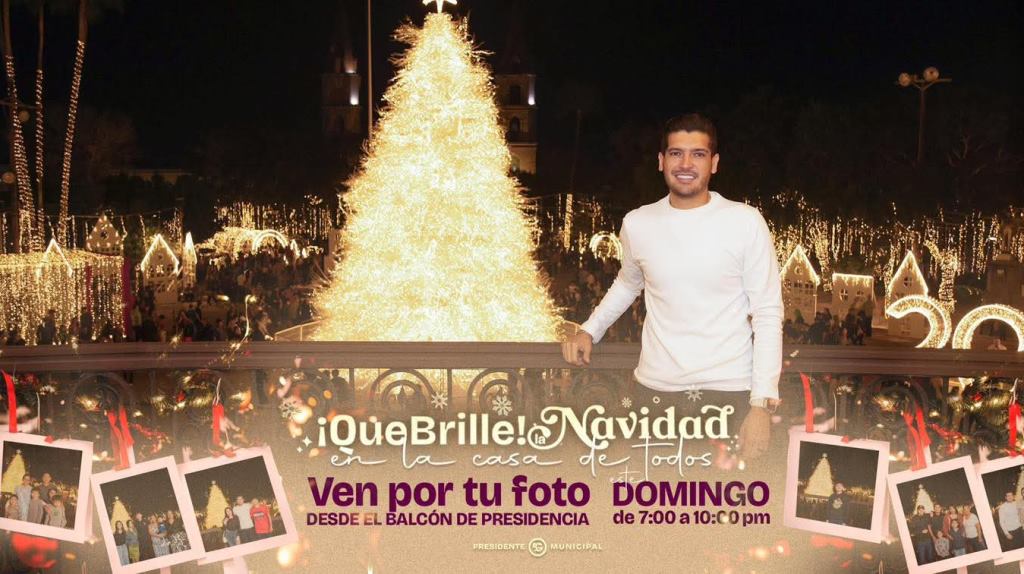 Matamoros, Tam.- El Gobierno de Beto Granados invita a las familias matamorenses a acudir al balcón presidencial para capturar un momento especial junto al pino navideño y disfrutar del ambiente festivo que se vive en el centro de la ciudad durante esta temporada decembrina.