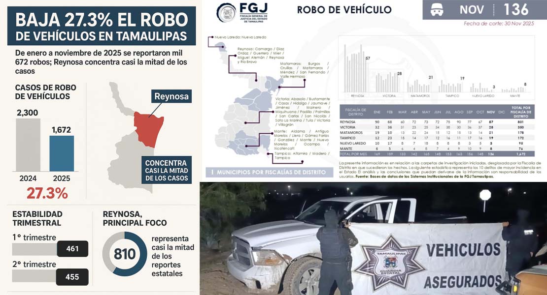 • De enero a noviembre de 2025 se reportaron mil 672 robos en Tamaulipas, baja 27.3%; Reynosa concentra casi la mitad de los casos.