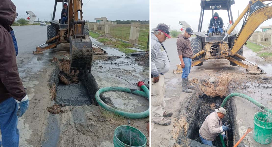 Reynosa, Tam.- La Comisión Municipal de Agua Potable y Alcantarillado de Reynosa lleva a cabo la reparación de una fuga de agua residual proveniente del emisor del Cárcamo 14, sobre la Carretera Reynosa–Río Bravo, con el objetivo de atender de manera oportuna la situación y evitar mayores afectaciones en la zona.
