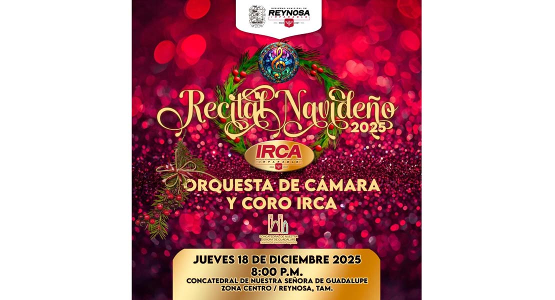 Reynosa, Tam.- El Gobierno de Reynosa, que preside el Alcalde Carlos Peña Ortiz, invita al público al Recital Navideño 2025 que el Instituto Reynosense para la Cultura y las Artes presentará este jueves 18 de diciembre a las 8:00 P. M. en la Concatedral de Nuestra Señora de Guadalupe.
