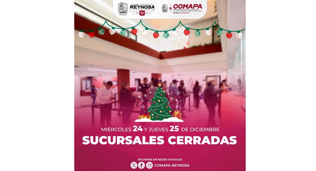 Reynosa, Tam.- La Comisión Municipal de Agua Potable y Alcantarillado de Reynosa informa a los usuarios que, con motivo de las festividades navideñas, las sucursales del organismo permanecerán cerradas los días miércoles 24 y jueves 25 de diciembre.