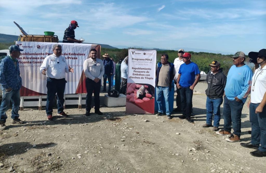 González, Tamaulipas.- Como parte de las acciones para fortalecer el sector pesquero en Tamaulipas, la Secretaría de Desarrollo Rural, Pesca y Acuacultura llevó a cabo la siembra de 200 mil alevines de tilapia en la presa Emilio Portes Gil y en la presa Vicente Guerrero, con el objetivo de impulsar la pesca comercial y el desarrollo económico de las comunidades rurales.