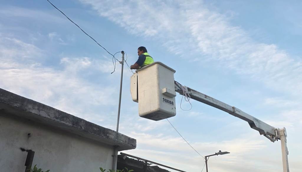 Reynosa, Tam.- El Gobierno Municipal del Alcalde Carlos Peña Ortiz esta realizando trabajo de reparación y mantenimiento en el alumbrado público de la ciudad, como el efectuado en la avenida Mil Cumbres donde se instaló cable 2+1 para alimentar 2 arbotantes y mejorar la visibilidad.