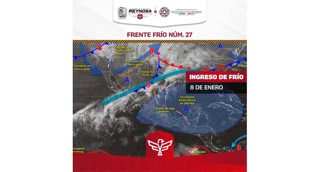 Reynosa, Tam.- La Coordinación de Protección Civil y Bomberos, del Gobierno Municipal de Reynosa, informa que el Frente Frío Número 27 está causando un leve descenso en la temperatura hoy jueves 8 de diciembre a los 21° Centígrados, después de que durante el día la máxima habrá llegado a los 31° C. y el viernes 9 la posibilidad de 17° Grados Celsius como mínima.