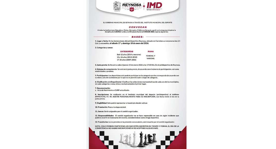 Reynosa, Tam.- El Alcalde Carlos Peña Ortiz, invita a todas las instituciones educativas, clubes, gimnasios y al público en general a participar en la Olimpiada Municipal en la disciplina de Ajedrez, evento clasificatorio rumbo a la Olimpiada Nacional CONADE.