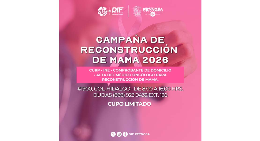 Reynosa, Tam.- Reafirmando el compromiso permanente con la salud de las mujeres, el Sistema DIF-Reynosa que preside Carlos Luis Peña Garza, dio inicio al registro de la Campaña de Reconstrucción de Mama 2026, dirigida a mujeres que han enfrentado el cáncer de mama, con el propósito de acompañarlas de manera integral en su proceso de recuperación, fortaleciendo su autoestima, seguridad personal y calidad de vida, acciones impulsadas por el Alcalde, Carlos Peña Ortiz.