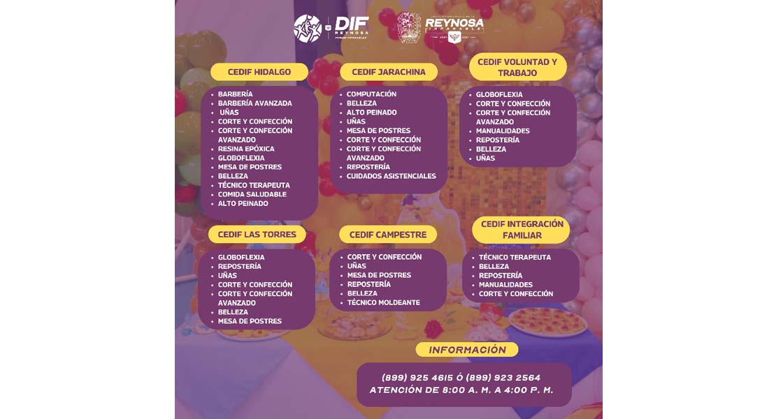 El DIF Municipal, invita a la ciudadanía interesada a inscribirse en los talleres: para mayores informes, las personas pueden comunicarse a los teléfonos 8999254615 y 8999232564, en un horario de atención de lunes a viernes de 8:00 de la mañana a 4:00 de la tarde.